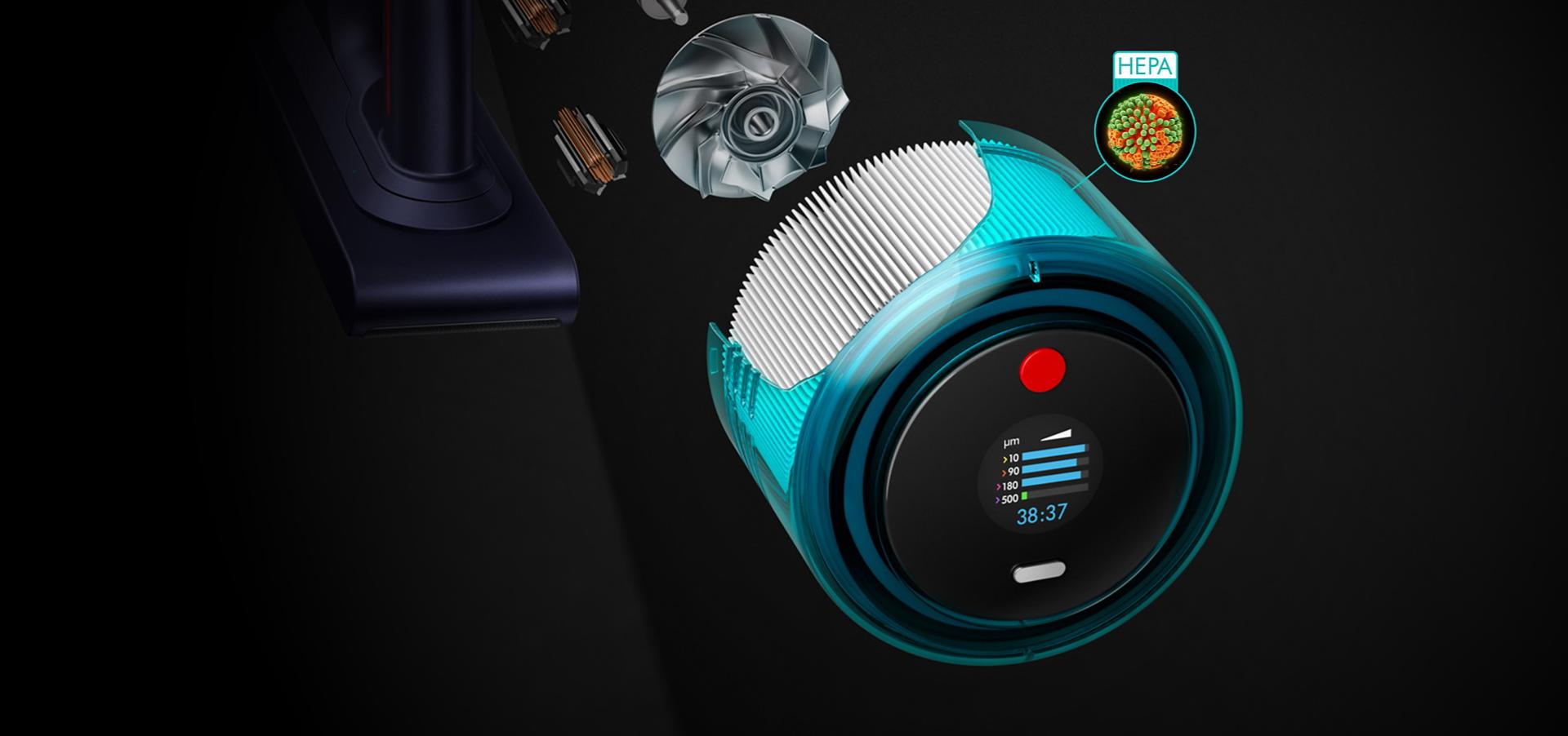 3Filtraciju testirala neovisna treća strana, tvrtka SGS IBR Laboratories u SAD-u, prema standardu ASTM F3150 u načinu rada Boost, 2022. godine. Učinkovitost filtracije izračunata je usporedbom broja standardiziranih čestica koje ulaze u usisavač i onih koje se ispuštaju. Stopa hvatanja može se razlikovati ovisno o stvarnom okružju i načinu rada.